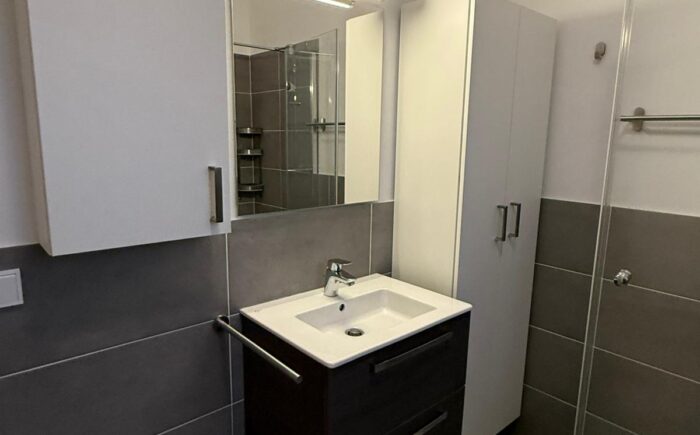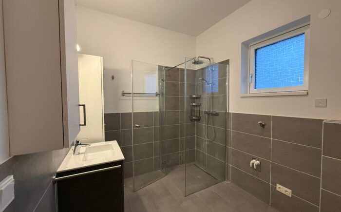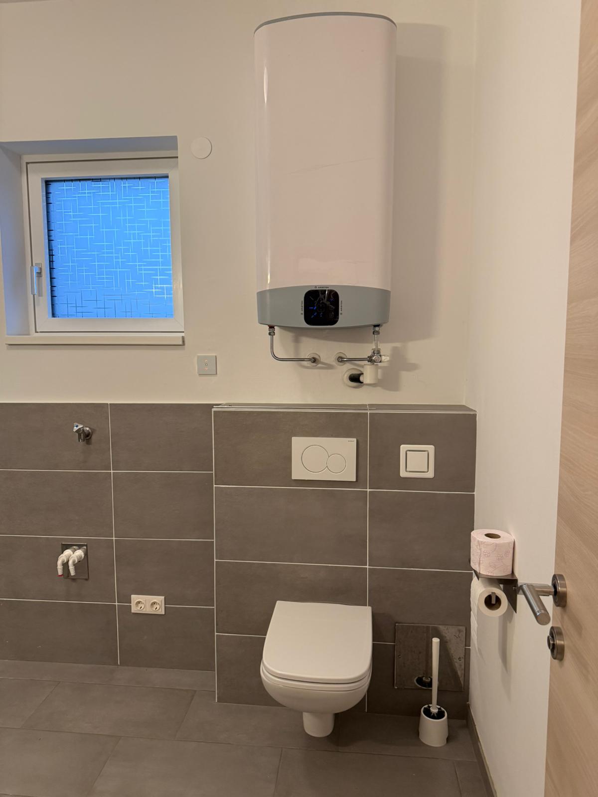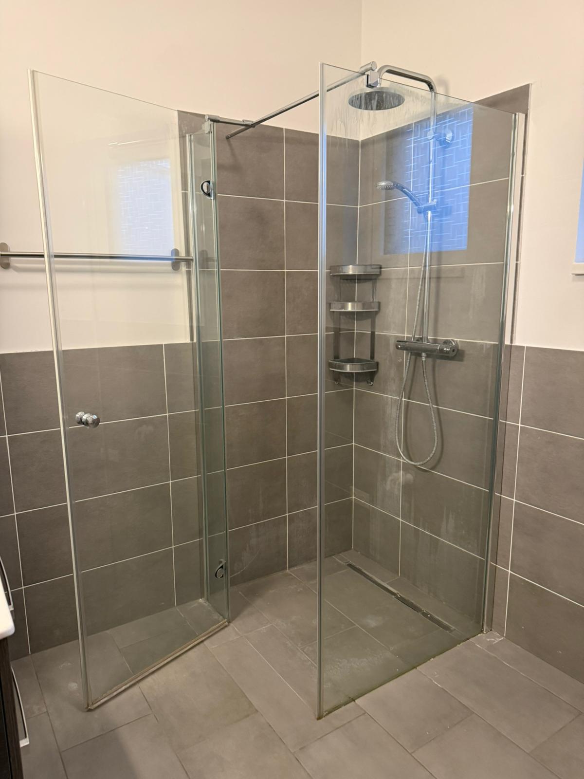 - Badezimmer mit Dusche, Waschbecken, Waschmaschinenanschluss und WC