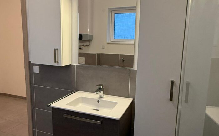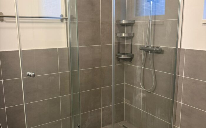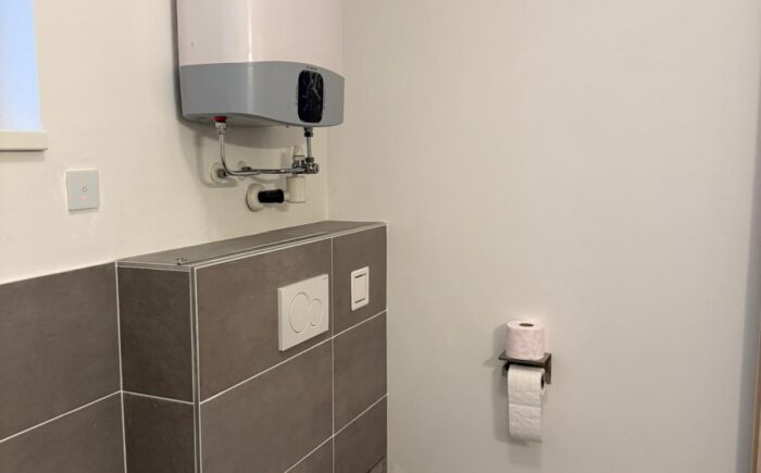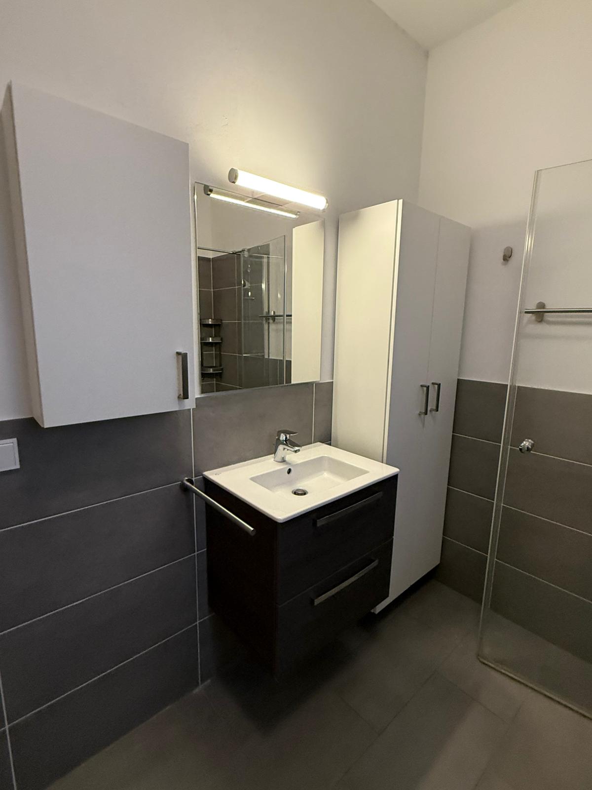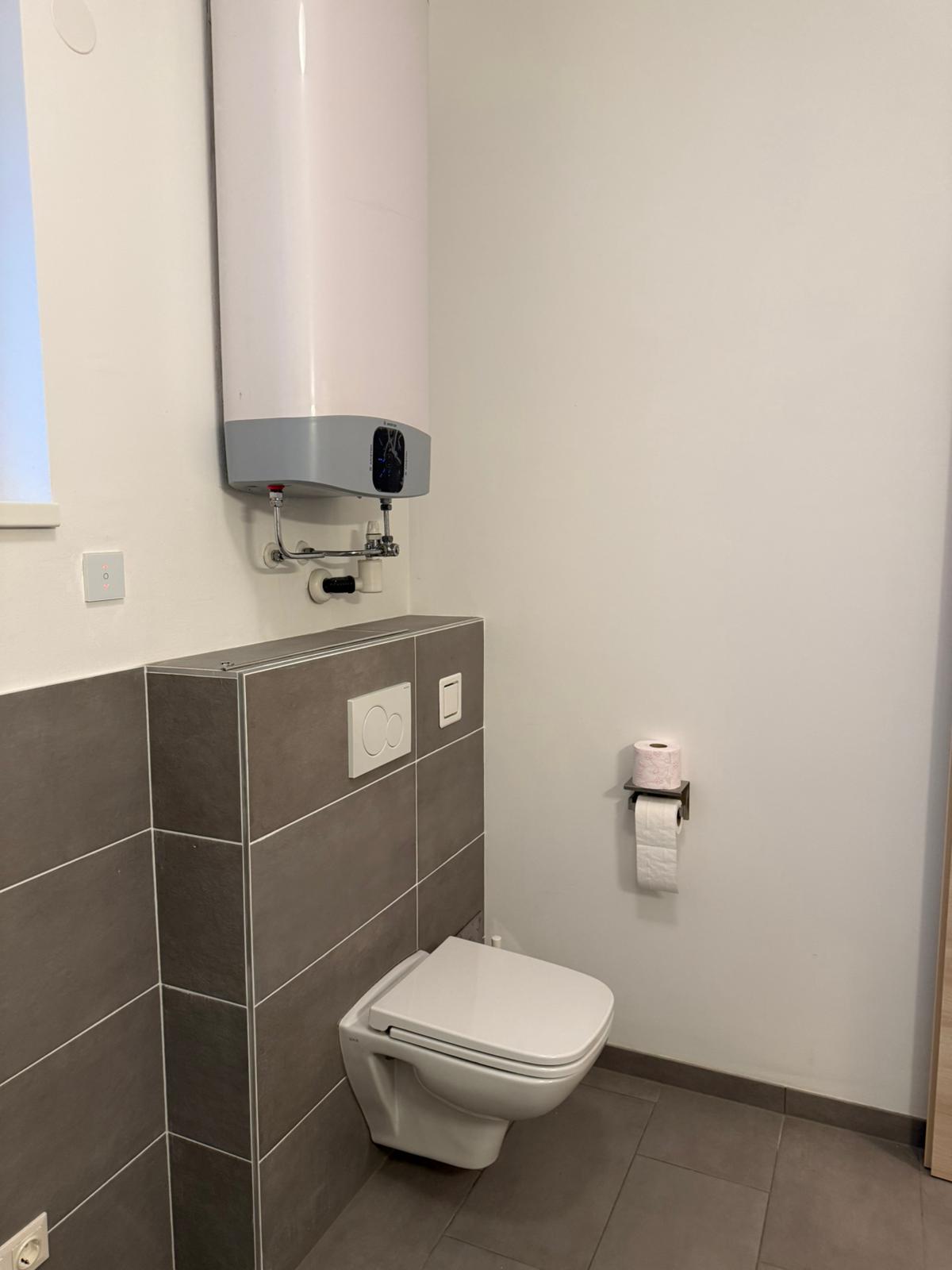 - Badezimmer mit Dusche, Waschbecken, Waschmaschinenanschluss und WC